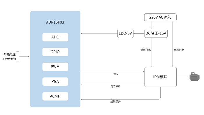 ADP16F03搭載16位定點(diǎn)DSP內(nèi)核(主頻150MHz,哈佛總線結(jié)構(gòu)),集成運(yùn)算加速單元(支持除法、開方和帕克變換等指令),高效運(yùn)行單電阻無感FOC算法,實(shí)現(xiàn)微秒級(jí)電機(jī)控制關(guān)鍵運(yùn)算,為壓縮機(jī)與外風(fēng)機(jī)協(xié)同調(diào)節(jié)提供強(qiáng)力算力保障。