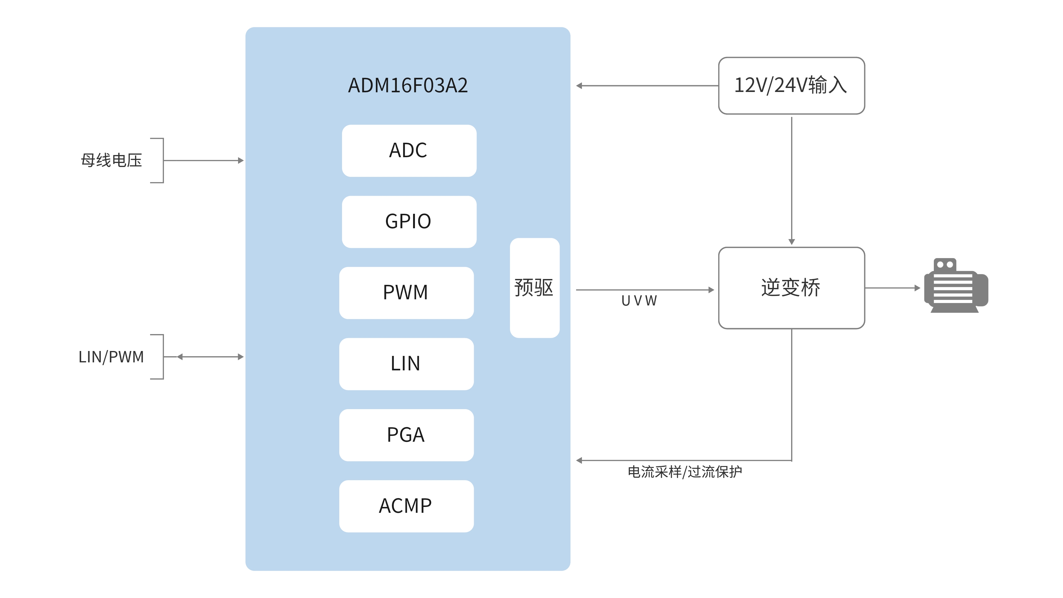 該方案采用自研無感單電阻FOC算法,具備母線電壓ADC檢測,可通過PWM/LIN進(jìn)行控制不同的轉(zhuǎn)速及故障反饋功能;具有順逆風(fēng)啟動,噪聲小,波形控制穩(wěn)定等特點(diǎn)